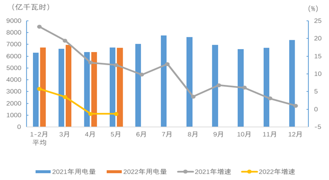 5月份,第一、二、三產業(yè)用電量增速分別為6.3%、-0.5%和-4.4%;城鄉(xiāng)居民生活用電量同比下降2.4%。