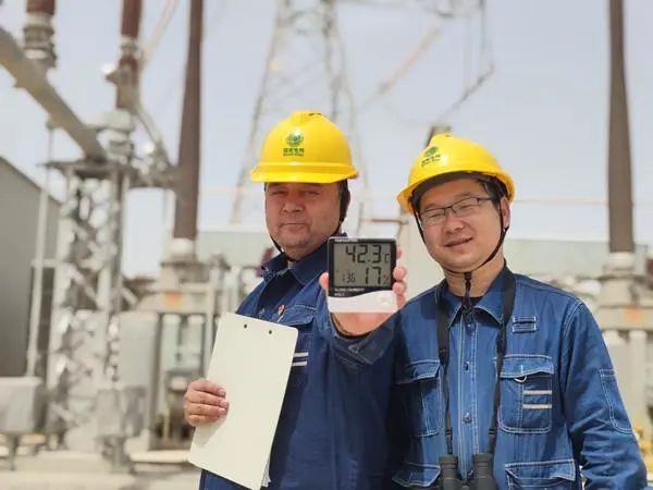 6月13日,750千伏巴楚變電站室外溫度達(dá)到42.3℃,值班員艾則孜·吐?tīng)柡?、靳永旺正在巡視設(shè)備。(白彥彬 攝)