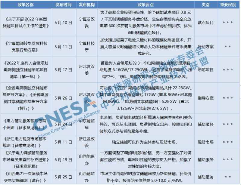 中國儲能網(wǎng)訊:5月儲能政策從國家到地方共有50余項發(fā)布或征求意見,涉及儲能規(guī)劃、可再生能源配置儲能、直接補貼、示范項目、輔助服務(wù)市場等方面。