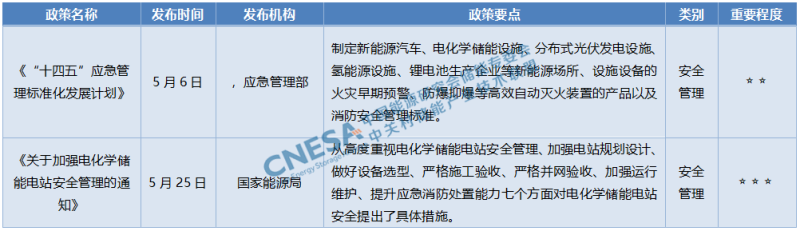 5月25日,國家能源局綜合司發(fā)布《關(guān)于加強電化學(xué)儲能電站安全管理的通知》,通知從高度重視電化學(xué)儲能電站安全管理、加強電站規(guī)劃設(shè)計、做好設(shè)備選型、嚴格施工驗收、嚴格并網(wǎng)驗收、加強運行維護、提升應(yīng)急消防處置能力七個方面對電化學(xué)儲能電站安全提出了具體措施。同時明確,業(yè)主(項目法人)是電化學(xué)儲能電站安全運行的責(zé)任主體,將接入10千伏及以上電壓等級公用電網(wǎng)的電化學(xué)儲能電站安全管理納入企業(yè)安全管理體系。該文件相較于去年8月國家發(fā)改委發(fā)布的《電化學(xué)儲能電站安全管理暫行辦法(征求意見稿)》,文件名稱從管理辦法調(diào)整為管理通知,執(zhí)行效力略有下降,且內(nèi)容上未提及各部委的職責(zé)分工。