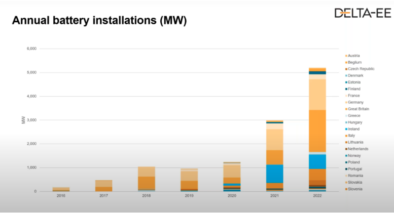 歐洲當(dāng)前和歷史電池儲(chǔ)能部署情況,圖源:Delta-EE