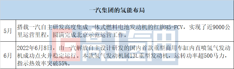 一汽解放作為“國(guó)車(chē)長(zhǎng)子”,經(jīng)過(guò)六十多年的發(fā)展,已成為國(guó)內(nèi)最大的汽車(chē)企業(yè)集團(tuán)之一,曾連續(xù)8年蟬聯(lián)世界500強(qiáng)榜單。在塑造新紅旗品牌時(shí)提出要直接切入新能源賽道,其以氫氣為主要?jiǎng)恿δ茉吹摹皻溱A計(jì)劃”,計(jì)劃到2030年,實(shí)現(xiàn)氫燃料電池產(chǎn)品商業(yè)化、分布式驅(qū)動(dòng)技術(shù)產(chǎn)業(yè)化,新能源車(chē)銷(xiāo)量占比達(dá)到60%。今年上半年布局事件如下: