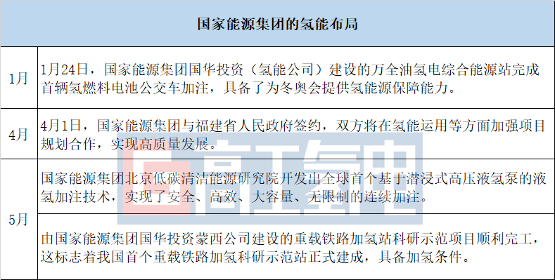 國(guó)家能源集團(tuán)在氫能源產(chǎn)業(yè)有著得天獨(dú)厚的優(yōu)勢(shì),提出了“技術(shù)儲(chǔ)備、項(xiàng)目示范、對(duì)外合作”發(fā)展思路,有序培育氫能等戰(zhàn)略性新興產(chǎn)業(yè),目前該公司正在加快布局從制氫到加氫站的氫能利用全產(chǎn)業(yè)鏈。今年上半年布局事件如下: