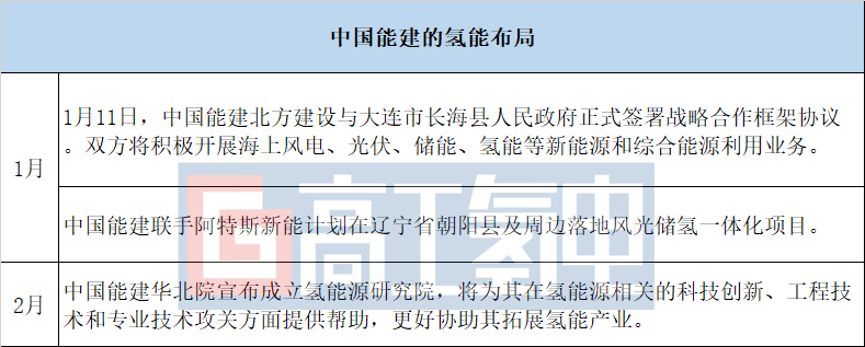 中國(guó)能建是一家為能源電力、基礎(chǔ)設(shè)施等行業(yè)提供整體解決方案、全產(chǎn)業(yè)鏈服務(wù)的綜合性特大型集團(tuán)公司。公司依托氫能公司開(kāi)展氫能前端技術(shù)研究、探索氫能商業(yè)模式、全面布局氫能產(chǎn)業(yè)鏈,正在努力推進(jìn)氫能在工業(yè)、建筑、交通等主要終端領(lǐng)域的低碳化應(yīng)用,并完善“風(fēng)光儲(chǔ)充換氫”供能體系。今年上半年布局事件如下: