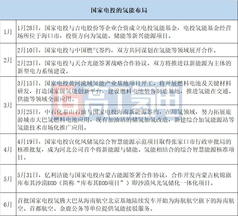 國(guó)家電投是我國(guó)五大發(fā)電集團(tuán)之一,是全國(guó)唯一同時(shí)擁有水電、火電、核電、新能源資產(chǎn)的綜合能源企業(yè)集團(tuán),也是最早發(fā)力氫能產(chǎn)業(yè)的央企之一,已經(jīng)成為推動(dòng)中國(guó)氫能與燃料電池產(chǎn)業(yè)化的重要力量。今年上半年布局事件如下: