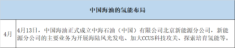 中國(guó)海油在布局氫能領(lǐng)域注重融合協(xié)同,加快發(fā)展海上風(fēng)電,擇優(yōu)發(fā)展陸上風(fēng)光,因地制宜發(fā)展氫能業(yè)務(wù),探索發(fā)展多能互補(bǔ)綜合能源供應(yīng)系統(tǒng),正在努力實(shí)現(xiàn)中國(guó)海油“十四五”末新能源新產(chǎn)業(yè)收入占比達(dá)到10%的目標(biāo)。今年上半年布局事件如下: