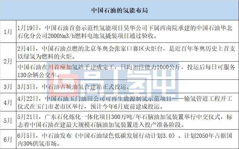 中國(guó)石油按照“戰(zhàn)略布局、穩(wěn)步推廣、規(guī)模發(fā)展”三步走階段部署發(fā)展氫能,重點(diǎn)發(fā)力,多元化制氫、低成本高效儲(chǔ)運(yùn)氫,致力打造國(guó)內(nèi)領(lǐng)先的氫能供應(yīng)商、貿(mào)易商、服務(wù)商。今年上半年布局事件如下: