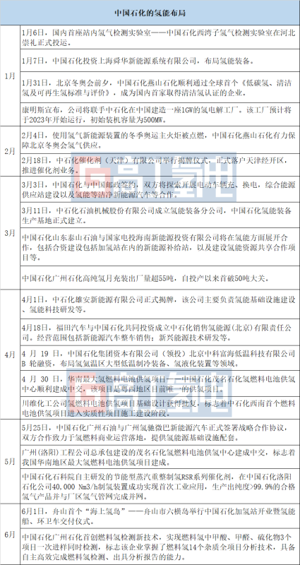 中石化是國(guó)內(nèi)能源巨頭,在國(guó)家能源戰(zhàn)略轉(zhuǎn)型背景下,中石化對(duì)氫能產(chǎn)業(yè)也進(jìn)行了全面的布局,并提出了成為“中國(guó)第一氫能公司”的目標(biāo)。中石化在“十四五”期間的發(fā)展目標(biāo)是建設(shè)全國(guó)最大的加氫站網(wǎng)絡(luò)、可再生能源制氫產(chǎn)量累計(jì)超百萬(wàn)噸,同時(shí)聚焦氫能交通領(lǐng)域和綠氫煉化。今年上半年布局事件如下: