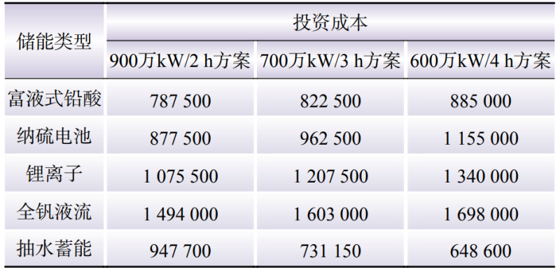 由表9可以看到,由于不同類型的儲(chǔ)能系統(tǒng)的功率成本、能量成本差異較大,造成不同配置方案的投資成本差別較大。對(duì)于電化學(xué)儲(chǔ)能系統(tǒng)來說,3種配置方案中,最優(yōu)的為鉛酸電池系統(tǒng)的900萬kW/2 h方案;若地理?xiàng)l件允許,抽水蓄能電站的600萬kW/4 h方案更優(yōu)。