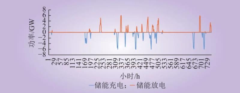 分析解集的規(guī)律,以2021年的計(jì)算結(jié)果為例,繪制儲(chǔ)能的功率和能量分析計(jì)算結(jié)果,如圖8所示??梢钥吹剑谶_(dá)到相同目標(biāo)的前提下,儲(chǔ)能的能量隨著儲(chǔ)能功率的增加而減少,且減少的趨勢(shì)逐步放緩。在功率較小時(shí)(初值290萬kW為起點(diǎn)),能量下降斜率較大,當(dāng)功率達(dá)到650萬kW以上時(shí),儲(chǔ)能的能量基本達(dá)到平穩(wěn)狀態(tài)。