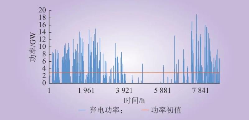 (1)儲(chǔ)能功率初值計(jì)算結(jié)果。根據(jù)常規(guī)機(jī)組開機(jī)時(shí)序和新能源出力預(yù)測(cè),以步長(zhǎng)1 h,周期8 760 h計(jì)算得到不配置儲(chǔ)能時(shí)該省級(jí)電力系統(tǒng)2021年共預(yù)計(jì)發(fā)生206次棄電,如圖3中藍(lán)色曲線所示,棄電電量83.7億kW·h,棄電率10.7%。