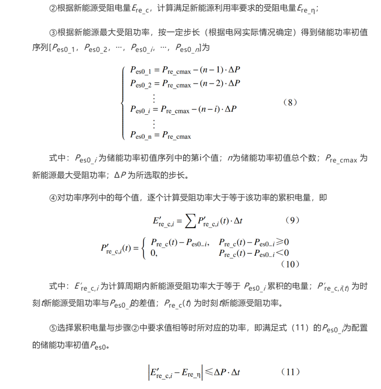 根據(jù)新能源利用率和負(fù)荷限電電量要求,結(jié)合儲(chǔ)能充放電策略,計(jì)算功率初值對(duì)應(yīng)的儲(chǔ)能能量。計(jì)算步驟為:①選擇儲(chǔ)能能量初值,可為單次新能源受阻電量和單次負(fù)荷限電電量中的最大值;②逐時(shí)段計(jì)算儲(chǔ)能的充、放電功率。儲(chǔ)能的充放電功率應(yīng)由儲(chǔ)能的荷電狀態(tài)、儲(chǔ)能功率、新能源受阻功率、負(fù)荷受限功率及系統(tǒng)允許儲(chǔ)能充放電功率綜合確定;③計(jì)算配置儲(chǔ)能后的新能源受阻電量和新能源利用率;④判斷新能源利用率是否滿足要求。新能源利用率小于目標(biāo)時(shí),增加儲(chǔ)能能量;新能源利用率大于目標(biāo)時(shí),減少儲(chǔ)能能量,直至滿足新能源利用率目標(biāo);判斷平抑的負(fù)荷限電電量是否滿足平衡要求,不滿足時(shí),增加儲(chǔ)能能量,直至滿足平衡要求。