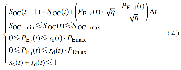 式中:SOC(t) 為時(shí)刻t的儲(chǔ)能荷電狀態(tài);PE_c(t) 為時(shí)刻t儲(chǔ)能的充電功率;PE_d(t) 為時(shí)刻t儲(chǔ)能的放電功率;η 為儲(chǔ)能充放電效率;Δt 為計(jì)算時(shí)間間隔;SOC_ max 為儲(chǔ)能最大荷電狀態(tài);SOC _ min 為儲(chǔ)能最小荷電狀態(tài);sc(t) 為儲(chǔ)能充電狀態(tài),為0-1變量,0表示不充電,1表示充電;sd(t) 為儲(chǔ)能放電狀態(tài),為0-1變量,0表示不放電,1表示放電;PEmax 為儲(chǔ)能額定功率。