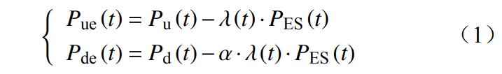 式中:Pue(t) 為儲(chǔ)能納入機(jī)組組合后時(shí)刻t常規(guī)電源調(diào)節(jié)上限;Pu(t) 為時(shí)刻t常規(guī)電源調(diào)節(jié)范圍上限;Pde(t) 為儲(chǔ)能納入機(jī)組組合后時(shí)刻t常規(guī)電源調(diào)節(jié)范圍下限;Pd(t) 為時(shí)刻t常規(guī)電源調(diào)節(jié)范圍下限;PES(t) 為時(shí)刻t儲(chǔ)能放電功率;λ(t) 為儲(chǔ)能等效置換常規(guī)機(jī)組的容量與儲(chǔ)能放電功率的比值;α 為常規(guī)機(jī)組最小技術(shù)出力與額定容量的比值。