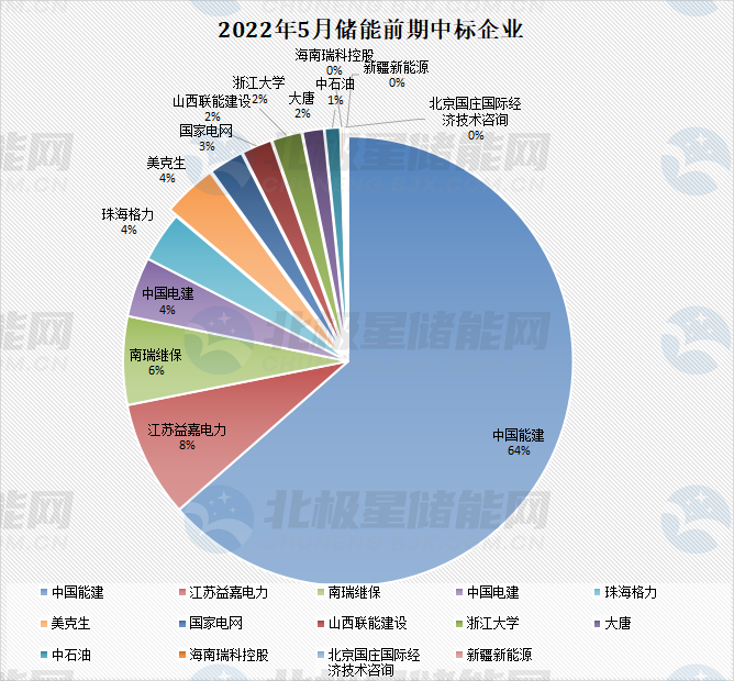 在儲能前期中標企業(yè)中,共有14家企業(yè)成功中標,其中中國能建中標總價最高,超3273萬,占投標總價64%。