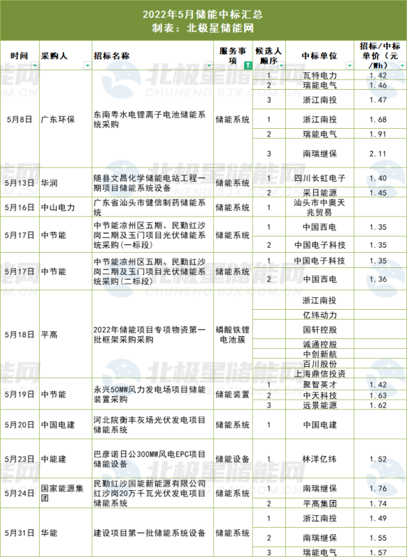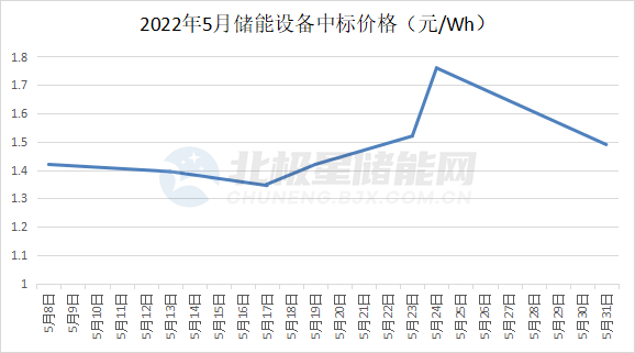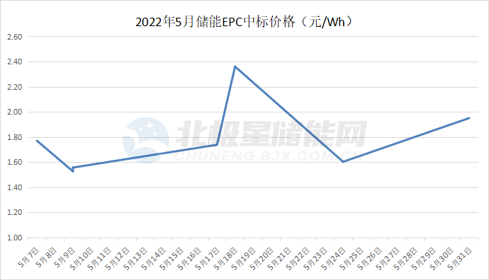 從儲能價格來看,據北極星儲能網不完全統(tǒng)計,2022年5月儲能EPC總承包的投標報價在1.51元/Wh到2.37元/Wh之間,整體平均投標價格為1.64元/Wh。