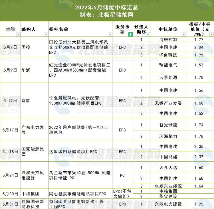 最低報價為中國電建集團江西省水電工程局有限公司的1.52元/Wh,參與的項目是北京京能清潔能源西北分公司發(fā)布的寧夏風電光伏配套150MW/300MWh儲能項目EPC工程。