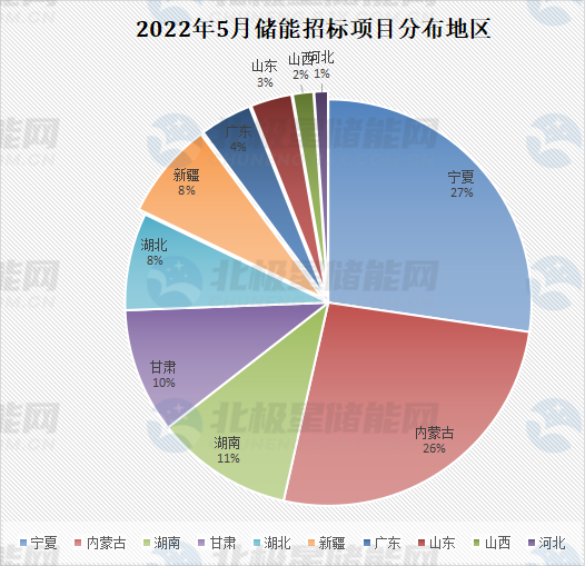 從地域來看,43個項目分布于廣東、山西、寧夏、甘肅、湖南、內蒙古等15省、自治區(qū),其中寧夏的項目數量最多、且合計規(guī)模最大,達到250MW/500MWh。招標項目中包括四個百兆瓦儲能項目,分別是同心縣泉眼儲能電站項目,益陽南縣儲能電站,烏蘭察布市興和縣風電儲能項目,寧夏所屬風電、光伏配套儲能項目。
