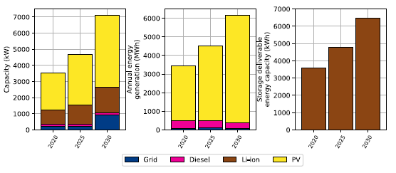 研究團(tuán)隊使用基于運營的設(shè)計優(yōu)化模型來確定不同電網(wǎng)可用性情景下成本最低的小型電網(wǎng)系統(tǒng)的規(guī)模??紤]的資源是太陽能發(fā)電設(shè)施、電池儲能系統(tǒng)、備用柴油發(fā)電機。該模型的目標(biāo)函數(shù)包括上述資源的年投資和運營成本。這些成本受到太陽能和電網(wǎng)供應(yīng)資源可用性和電池儲能系統(tǒng)操作相關(guān)的限制。研究團(tuán)隊在模型中包含以下費用:(1)DUoS費用,是項目開發(fā)商為使用配電網(wǎng)絡(luò)向公用事業(yè)公司支付的電力費用;(2)開發(fā)商費用是指開發(fā)商從公用事業(yè)公司購買電力為消費者供電或為電池儲能系統(tǒng)充電。電網(wǎng)可用性構(gòu)建為每小時時間序列,包括隨機模擬頻率和持續(xù)時間的停電。對于每個投資期,在給定電網(wǎng)可用性的情況下,生成的程序會生成一個確定性的解決方案。為了探索小型電網(wǎng)設(shè)計和資源組合隨著時間的演變,研究團(tuán)隊對2020年、2025年和2030年三個投資期進(jìn)行了優(yōu)化。為了研究不確定電網(wǎng)中斷的影響,研究團(tuán)隊對描述的電網(wǎng)可用性配置文件集合采用了蒙特卡羅模擬方法。研究團(tuán)隊報告了集成中最常出現(xiàn)的系統(tǒng)設(shè)計。