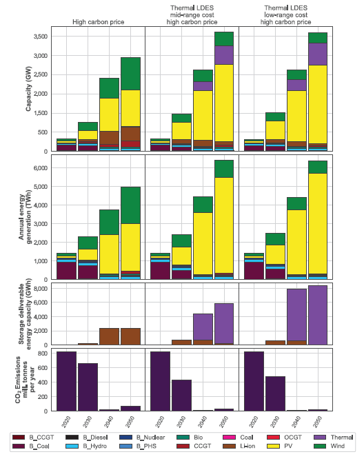 第6章中介紹的美國幾個地區(qū)的模型結(jié)果,以及作為研究團(tuán)隊在本章第7.2.3節(jié)中評估分布式儲能系統(tǒng)影響的一部分討論的低成本鋰離子電池儲能方案,強調(diào)了獲得低成本的鋰離子電池的重要性,從而用于電網(wǎng)脫碳。預(yù)期電池成本的下降趨勢,尤其是長時儲能的成本下降也很重要。在這里,研究團(tuán)隊探討了從2040年開始的長時儲能技術(shù)的可用性如何影響印度電力系統(tǒng)的發(fā)展。在研究團(tuán)隊的分析中,使用熱儲能作為長時儲能的代表技術(shù),并檢查其在不同碳排放政策情景下的作用,包括假設(shè)沒有碳排放政策的參考案例和碳價格從2030年的20美元/噸上漲到接近的情景到2050年的50美元/噸。研究團(tuán)隊還考慮了長時儲能在替代成本和性能假設(shè)下的作用(即中低端成本假設(shè),在2040年和2050年保持不變)。