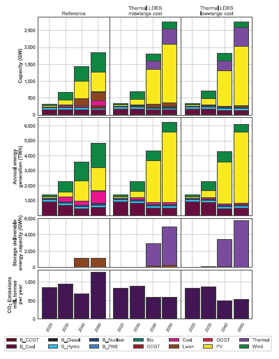 圖7.17參考案例(第1列)和中低成本長時儲能案例(分別為第2列和第3列)的模型結(jié)果