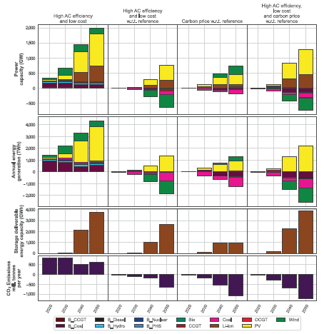 圖7.16 空調(diào)高需求/低成本案例(由低電池儲能資本成本、空調(diào)高需求和天然氣價格低)(第1列)的模型結(jié)果,以及有無情景假設(shè)的碳價格影響