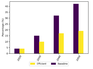 總體而言,在研究團(tuán)隊考慮的所有技術(shù)案例中,空調(diào)高需求/低成本案例導(dǎo)致在建模時間范圍內(nèi)對燃煤發(fā)電廠的投資最低。如圖7.16所示,與2050年的參考情況相比,它還導(dǎo)致每年的碳排放量減少18%。然而,即使在空調(diào)高需求/低成本的情況下,到2050年現(xiàn)有燃煤發(fā)電量仍占總發(fā)電量的17%。這表明需求方和供應(yīng)方機(jī)制不足以實現(xiàn)深度電網(wǎng)脫碳,可能需要采取額外的政策措施。