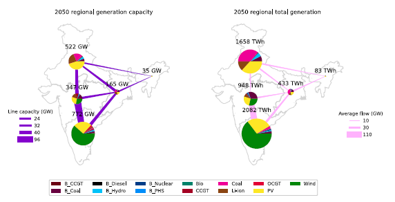 圖7.13 印度2050年發(fā)電和輸電的區(qū)域容量和利用趨勢