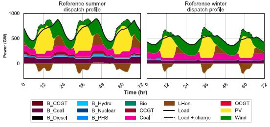 圖7.12 印度2050年夏季(左)和冬季(右)三天的小時發(fā)電調(diào)度和負(fù)荷曲線