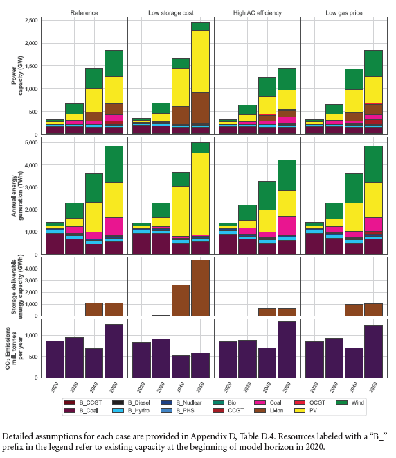 作為一項潛在的政策措施,圖7.16顯示了2030年碳價格為每噸20美元,并且每年上漲5%,到2050年增長到50美元/噸。其影響與參考案例相比,對價格上漲的預(yù)期導(dǎo)致現(xiàn)有燃煤發(fā)電的利用率降低和提前退役,幾乎完全替代燃煤發(fā)電設(shè)施,并將增加對低碳發(fā)電(主要是可再生能源)和儲能系統(tǒng)的投資。與2050年相比,這將減少86%的碳排放量。到2050年50美元/噸碳價格對系統(tǒng)平均電力成本(SCOE)的相對較大影響,可以通過采用高效的空調(diào)在一定程度上減輕,無論是出于有利的成本考慮還是政策。假設(shè)普遍采用高效的空調(diào)、50美元/噸的碳價格以及燃煤發(fā)電設(shè)施的退役,估計2050年的碳排放量比參考案例估計值低97%,電力系統(tǒng)平均排放量為8gCO2/kWh(圖7.16,第4列)。