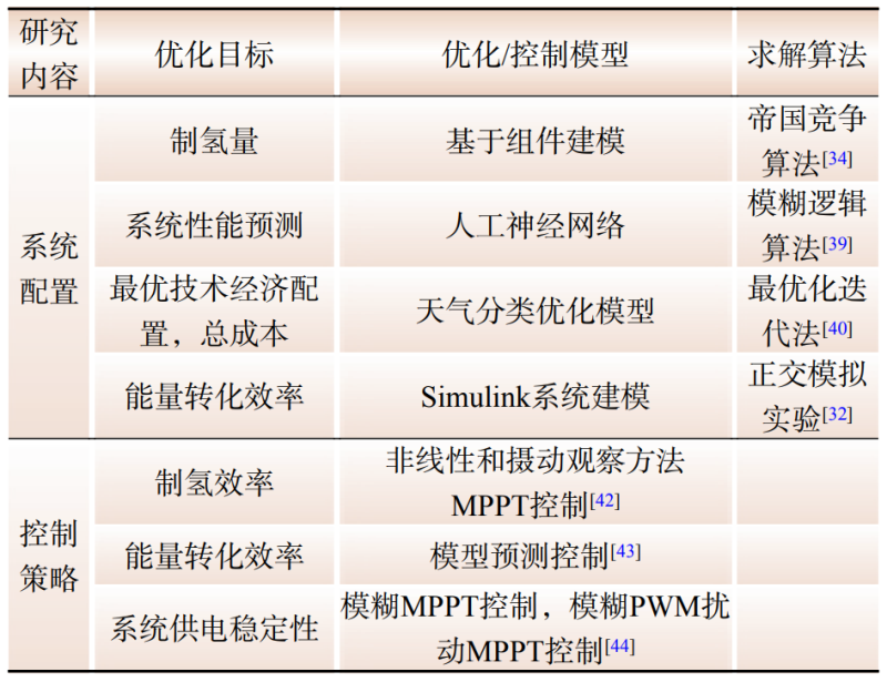 近年來,風(fēng)光互補發(fā)電耦合氫儲能系統(tǒng)容量配置與控制優(yōu)化研究總結(jié)如表1所示。合理的容量配置不僅能保證各裝置單元高效協(xié)同運行,而且最大限度地降低成本。文獻(xiàn)[39]將基于模糊邏輯算法的人工神經(jīng)網(wǎng)絡(luò)算法應(yīng)用于系統(tǒng)的容量優(yōu)化配置,獲得了較好的系統(tǒng)性能預(yù)測準(zhǔn)確性。文獻(xiàn)[40]運用迭代最優(yōu)化的方法確定系統(tǒng)的最優(yōu)技術(shù)經(jīng)濟配置和總成本,證明了風(fēng)光互補發(fā)電混合系統(tǒng)與化石燃料相比在成本和效率方面有一定優(yōu)勢。文獻(xiàn)[41]通過實驗仿真和數(shù)據(jù)分析指出,基于當(dāng)?shù)氐奶鞖鈹?shù)據(jù)及環(huán)境特征進(jìn)行風(fēng)力、太陽能發(fā)電和儲能等模塊的容量配置設(shè)計,才能更好地挖掘風(fēng)能和太陽能的開發(fā)利用潛力,并結(jié)合河北省的太陽能和風(fēng)能資源,分析了風(fēng)光互補發(fā)電耦合氫儲能系統(tǒng)在河北省不同地區(qū)的適用性。