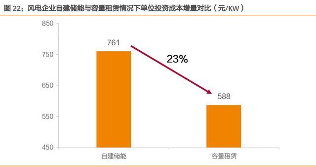 輔助服務市場放開,獨立儲能是更加貼合政策導向的獨立市場主體。2021 年底新發(fā)布的 “兩個細則”擴大了輔助服務的提供主體,豐富了輔助服務的服務品種,輔助服務市場向 儲能放開?!丁笆奈濉毙滦蛢δ馨l(fā)展實施方案》中明確提出,要推動儲能作為獨立主體參與各類電力市場,相比傳統(tǒng)依附于發(fā)電側(cè)的商業(yè)模式,獨立儲能電站更加貼合該政策導向。 同時,由于其“獨立性”,該模式下責任主體更為明確,有利于進一步提高儲能電站發(fā)展 建設的規(guī)范性與安全性。 同時滿足多方需求,“一站多用”共享模式助力收入渠道擴展。獨立儲能電站除了能夠作為傳統(tǒng)電網(wǎng)側(cè)儲能設施滿足其調(diào)峰調(diào)頻需求外,還可以滿足發(fā)電側(cè)的儲能需求。2021 年 8 月,國家能源局及發(fā)改委發(fā)布《關于鼓勵可再生能源發(fā)電企業(yè)自建或購買調(diào)峰能力增加并 網(wǎng)規(guī)模的通知》,確定新能源發(fā)電企業(yè)可通過租賃儲能容量,滿足新增新能源裝機調(diào)峰能力建設需求。以陸上風電為例,根據(jù)測算,相比于自建儲能,發(fā)電企業(yè)選擇租賃儲能容量 時(15%配儲比例),總投資成本可降低 23%左右,差距明顯。