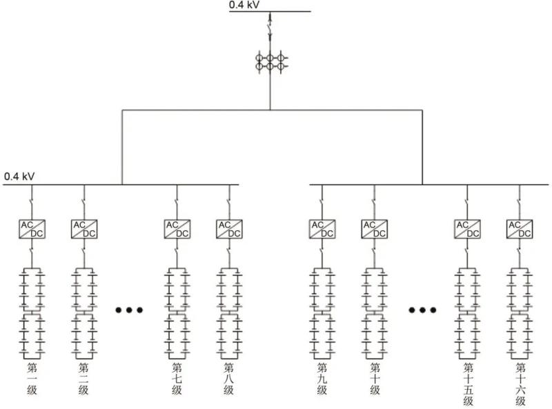 本項(xiàng)目?jī)?chǔ)能系統(tǒng)通過(guò)一路出線接入0.4 kV電壓母線,系統(tǒng)整體架構(gòu)如圖7所示。