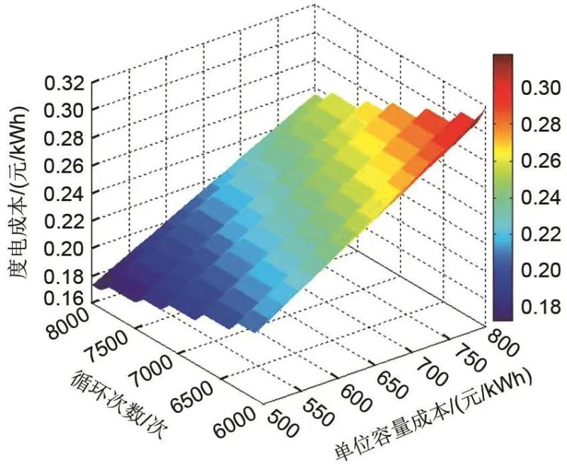 圖4 單位容量成本和循環(huán)次數(shù)對(duì)儲(chǔ)能度電成本的影響