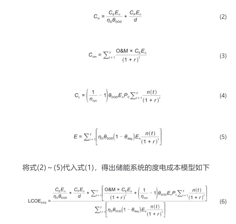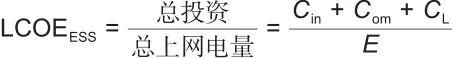 式中,LCOEESS為儲(chǔ)能系統(tǒng)平準(zhǔn)化全壽命度電成本,元/(kWh);Cin為初始投資成本,即儲(chǔ)能系統(tǒng)建設(shè)時(shí)投入的成本,通常包括設(shè)計(jì)、硬件、軟件、工程、采購(gòu)、施工等產(chǎn)生的總費(fèi)用;Com為運(yùn)行維護(hù)成本,即儲(chǔ)能系統(tǒng)在每年運(yùn)行和維護(hù)過(guò)程中產(chǎn)生的費(fèi)用,包含容量維護(hù)成本、功率維護(hù)成本和人工運(yùn)營(yíng)成本;CL為電力損耗成本,即儲(chǔ)能系統(tǒng)在全生命周期內(nèi)從電網(wǎng)或其他能源電源處充放電花費(fèi)的所有費(fèi)用;E為系統(tǒng)全生命周期上網(wǎng)電量,指儲(chǔ)能系統(tǒng)每年向電網(wǎng)輸出的電量,與儲(chǔ)能系統(tǒng)的放電效率、儲(chǔ)能容量、年循環(huán)次數(shù)和放電深度等有關(guān)。