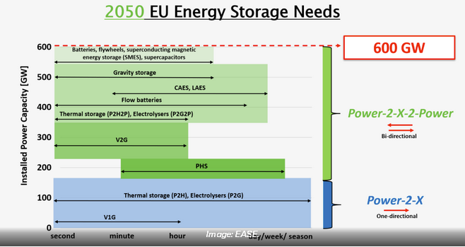 該協(xié)會在其報告中將2050年600GW儲能系統(tǒng)部署目標(biāo)分為兩個部分。435GW儲能系統(tǒng)需要來自“Power-to-X-to-Power”解決方案,而剩余的165GW可以通過提供單向系統(tǒng)靈活性的“power-to-X”技術(shù)提供。