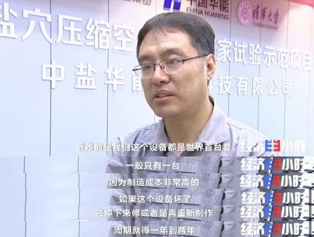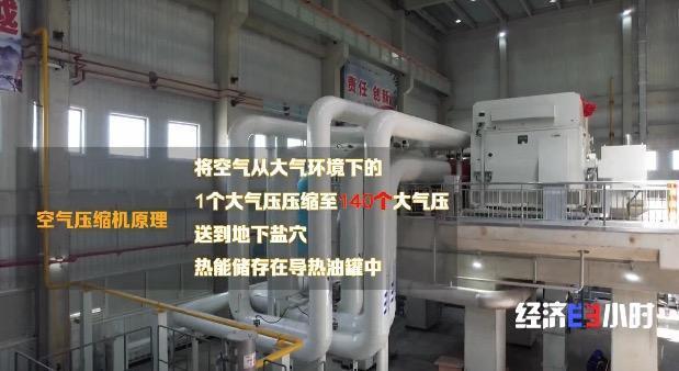 這臺空氣壓縮機(jī)的原理有點(diǎn)像我們給輪胎充氣的“打氣筒”,它的作用是將空氣從大氣環(huán)境下的1個(gè)大氣壓,壓縮至140個(gè)大氣壓,并送到地下鹽穴。產(chǎn)生的熱能儲存在導(dǎo)熱油罐中,持續(xù)8個(gè)小時(shí),電站就完成了一個(gè)儲能周期。