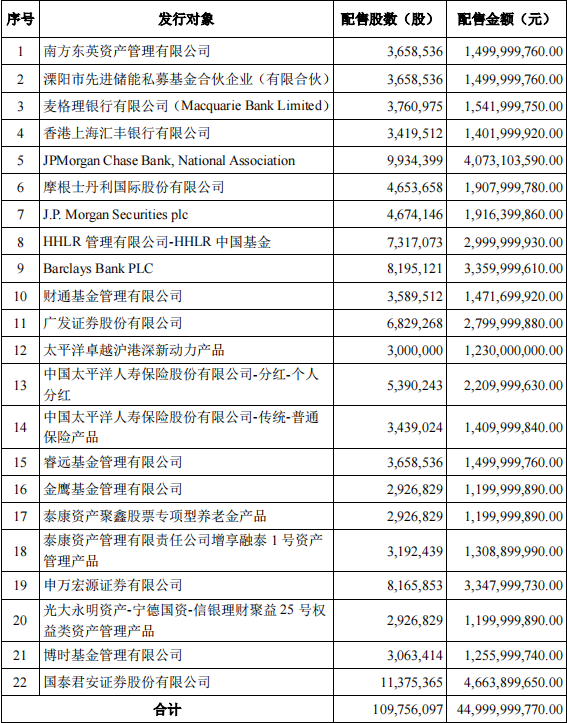 6月22日晚,寧德時(shí)代(SZ300750,股價(jià)507.00元,市值1.18萬(wàn)億元)發(fā)布公告稱,本次定增的發(fā)行價(jià)格最終為410元/股,共募集資金總額約為450億元,扣除各項(xiàng)發(fā)行費(fèi)用(不含增值稅)后,實(shí)際募集資金凈額人民幣448.7億元。共有22家投資者獲配。其中,國(guó)泰君安、J.P.Morgan Chase Bank、Barclays Bank Plc分別以46.6億元、40.7億元和33.6億元排在本次配售金額的前三位。