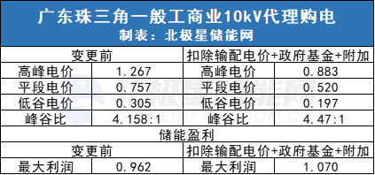 以廣東珠三角地區(qū)為例,一般工商業(yè)10kV輸配電價0.2094元/kWh,政府性基金及附加0.0276元/kWh,如果相應(yīng)充電電量不承擔輸配電價和政府性基金及附加,則平段電價達到0.5197元/kWh,與此同時,高峰低谷電價按當?shù)卣弑壤齽t變成0.883元/kWh、0.197元/kWh。電價峰谷比由原來的4.158:1,變成4.47:1,峰谷比拉大。