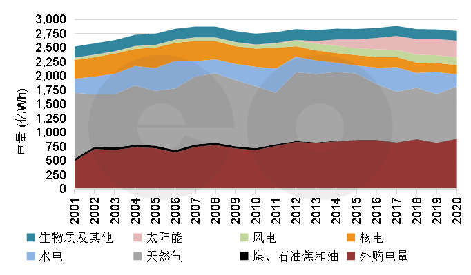 第一,2007年,加州的能源碳排放量達(dá)到峰值,在應(yīng)對氣候變化行動(dòng)的作用下,未來碳排放量將進(jìn)入下降通道。能源消費(fèi)量、用電量的歷史峰值年份與碳排放量峰值基本是同期的,但能源消費(fèi)量、用電量未來仍有繼續(xù)增長的可能。