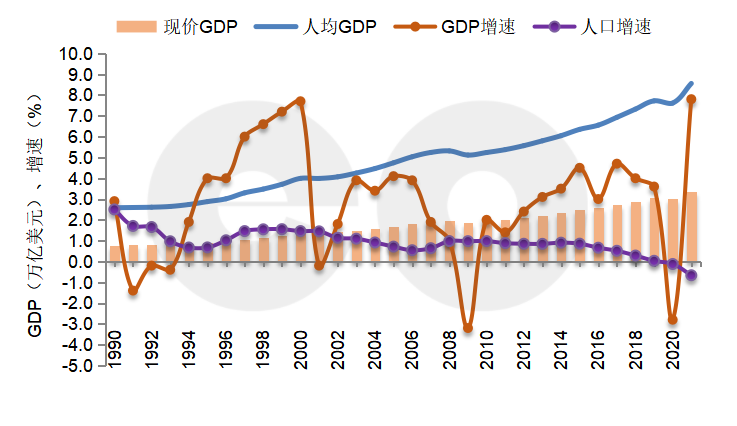 圖2 加州GDP、人均GDP、GDP增速及人口增速變化