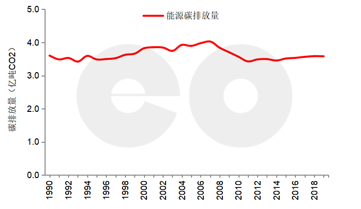 近30年來,碳排放量在峰值附近窄幅波動(dòng)。能源碳排放量與化石能源消費(fèi)量及結(jié)構(gòu)相關(guān)。目前碳排放量為峰值年的89%,與1990年相當(dāng);2007年至今碳排放量年均下降1%??傮w上看,近30年碳排放量波動(dòng)較?。ㄒ妶D3)。未來,碳排放量雖然會有所波動(dòng),但都將處于下降通道。