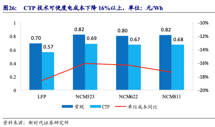 在2020年新時(shí)代證券的一份研報(bào)的測(cè)算中,數(shù)據(jù)顯示 CTP技術(shù)可以使得車用度電成本下降16%。
