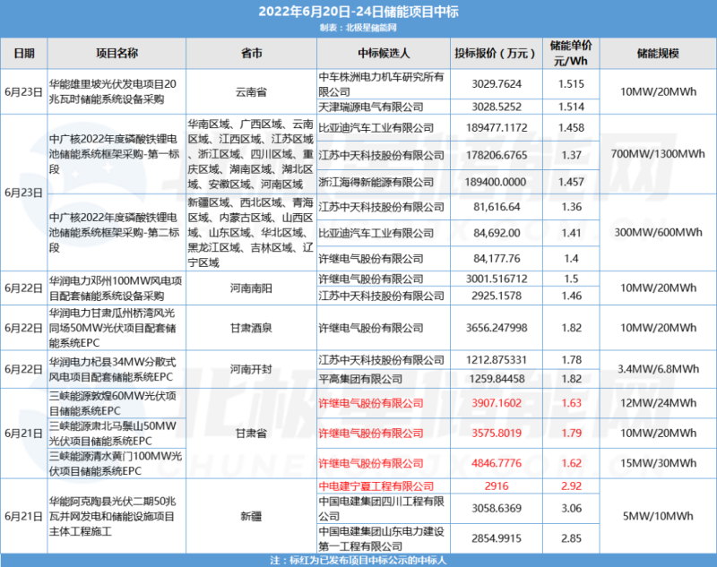 6月23日,中廣核風(fēng)電有限公司發(fā)布2022年度磷酸鐵鋰電池儲能系統(tǒng)框架采購第二標(biāo)段中標(biāo)候選人公示。第一候選人為江蘇中天科技股份有限公司,投標(biāo)價(jià)格為81616.638672萬元,投標(biāo)單價(jià)1.36元/Wh。第二候選人為比亞迪汽車工業(yè)有限公司,投標(biāo)價(jià)格為84692.001006萬元,投標(biāo)單價(jià)1.41元/Wh。第三候選人為許繼電氣股份有限公司,投標(biāo)價(jià)格為84177.7600萬元,投標(biāo)單價(jià)1.4元/Wh。