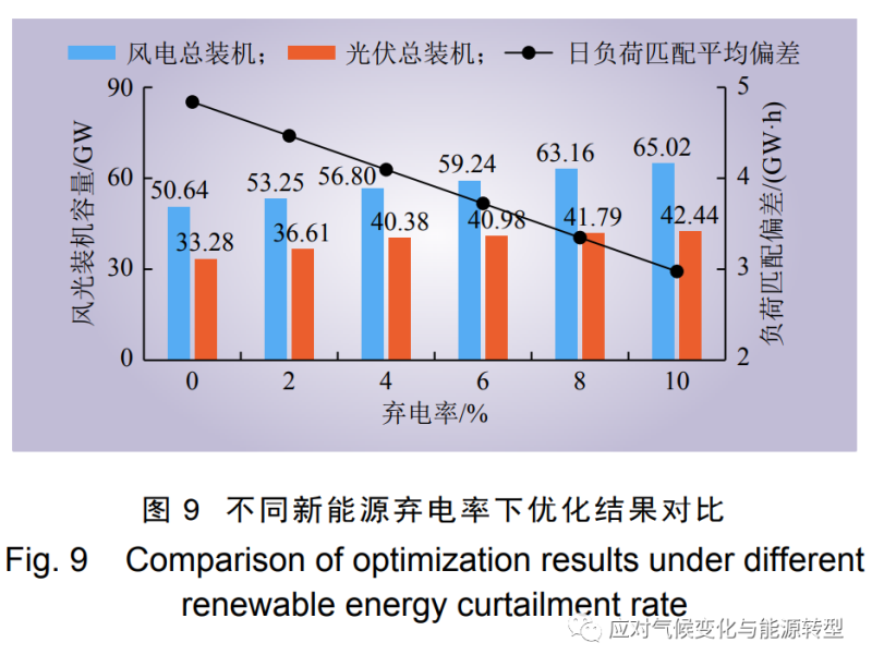 (4)假定儲(chǔ)能裝機(jī)規(guī)模 5 GW/10 GW·h,若新能源最大棄電率由 0 增加到 10% ,隨著棄電率上限的不斷增加,新能源的最優(yōu)接入容量也不斷增加,當(dāng)棄電率為 10% 時(shí),風(fēng)光容量達(dá)到最大值 65.02 GW 和 42.44 GW。并且風(fēng)電的增長(zhǎng)趨勢(shì)高于光伏,這也進(jìn)一步證實(shí)了大規(guī)模光伏較風(fēng)電更難以與負(fù)荷進(jìn)行匹配,系統(tǒng)更傾向于配置互補(bǔ)性更強(qiáng)的風(fēng)電。此外,隨著棄電率的增加,日負(fù)荷匹配平均偏差呈下降趨勢(shì),由4.84 GW·h 降至 2.98 GW·h,這說明允許一定的棄電率可使系統(tǒng)發(fā)電功率與負(fù)荷形狀更容易匹配。