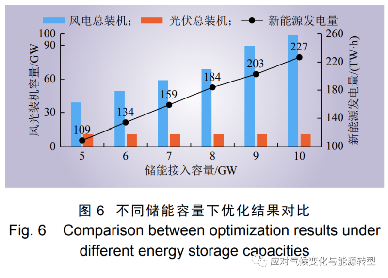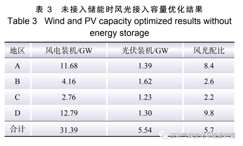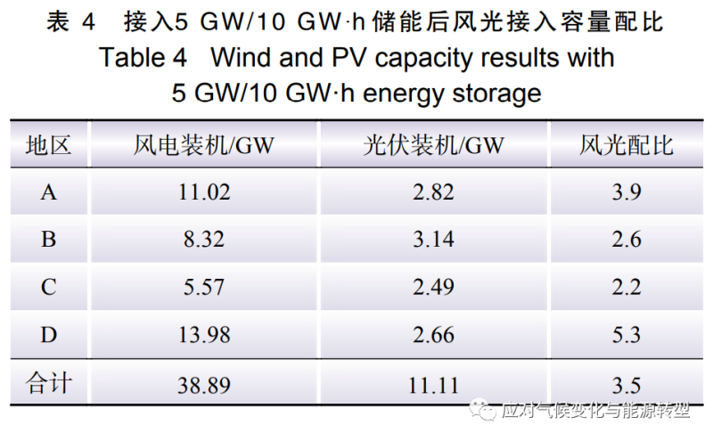 (3)論文的仿真結(jié)果顯示,由于風(fēng)電的利用小時(shí)數(shù)更高,廣域互補(bǔ)特性更強(qiáng),從源-荷匹配的角度來看,系統(tǒng)會(huì)優(yōu)先接納風(fēng)電(然而從各省已經(jīng)公布的“十四五”可再生能源規(guī)劃看,光伏的新增裝機(jī)容量普遍大于風(fēng)電。從全國(guó)總量上看,光伏新增裝機(jī)容量約為風(fēng)電的2倍,這與論文結(jié)論不太吻合。我們猜測(cè),各省能源主管部門在制定規(guī)劃時(shí),可能更多考慮的是光伏的多應(yīng)用場(chǎng)景和工程建設(shè)短平快的特點(diǎn),而對(duì)風(fēng)光資源的出力特性、互補(bǔ)特性以及系統(tǒng)的消納能力考慮不夠);由于光伏出力的日變化特性顯著,儲(chǔ)能與光伏的協(xié)調(diào)互補(bǔ)作用更加明顯,在接入儲(chǔ)能后系統(tǒng)的光伏接入容量會(huì)顯著增加(也就說,從風(fēng)光出力特性上看,光伏與儲(chǔ)能更加協(xié)調(diào)互補(bǔ),而風(fēng)電與“大電網(wǎng)”更加協(xié)調(diào)互補(bǔ))。