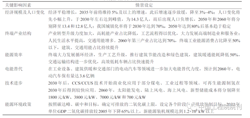 以2060年前我國實現(xiàn)碳中和為目標,倒逼能源系統(tǒng)轉(zhuǎn)型和社會經(jīng)濟結(jié)構(gòu)調(diào)整。當前我國森林、海洋等碳匯存量僅6×108~7×108 t,考慮未來生態(tài)碳匯增長,預計到2060年也不超過1.5×109 t,同時考慮工業(yè)過程二氧化碳排放與非二氧化碳溫室氣體等尚無有效減排途徑,生態(tài)碳匯將主要分配于這些領域,能源系統(tǒng)只能保留少量化石能源消費,電力行業(yè)著力構(gòu)建零碳新型電力系統(tǒng)。到2060年,電力系統(tǒng)保留的火電排放的CO2將全部通過加裝CCS/CCUS、BECCS等移除,情景相關設定詳見表2。