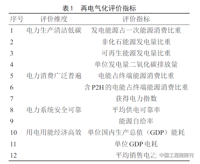 再電氣化與傳統(tǒng)電氣化的主要區(qū)別在于目標是構(gòu)建清潔低碳安全高效的能源系統(tǒng),以電能為平臺樞紐,實現(xiàn)各種能源交匯轉(zhuǎn)換,保障經(jīng)濟社會高質(zhì)量發(fā)展。傳統(tǒng)電氣化的評價指標主要是發(fā)電能源占一次能源消費比重和電能占終端能源消費比重。由于再電氣化的內(nèi)涵與傳統(tǒng)電氣化產(chǎn)生了差異,再電氣化不僅是提高電能比重,更是實現(xiàn)整體能源系統(tǒng)的低碳化和高效化。根據(jù)再電氣化的目標要求,可將其特征概括為4個維度:電力生產(chǎn)清潔低碳、電力消費廣泛普遍、電力系統(tǒng)安全可靠、用電用能經(jīng)濟高效。以這4個特性作為一級指標構(gòu)建再電氣化評價指標體系,如表1所示。