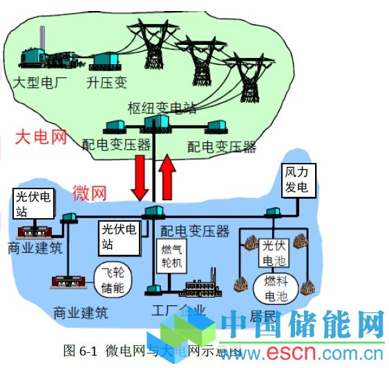 所謂“微電網(wǎng)”,是指采用光伏發(fā)電作為白天的主要供電電源,同時(shí)利用其它能夠與光伏互補(bǔ)的各種可再生能源的同時(shí)接入來滿足不同氣候條件下的電力供應(yīng),利用儲(chǔ)能系統(tǒng)和包括微型燃?xì)廨啓C(jī)等清潔能源作為供電的調(diào)節(jié)手段,通過先進(jìn)的自動(dòng)控制技術(shù)和信息網(wǎng)絡(luò)技術(shù)實(shí)現(xiàn)網(wǎng)內(nèi)的智能控制和網(wǎng)間的遠(yuǎn)程調(diào)度,直接對供電區(qū)域內(nèi)部的用戶負(fù)荷直接供電的電網(wǎng)。所謂“微”,指的是與現(xiàn)有國家電網(wǎng)相比的,并非指容量小于某個(gè)具體的值。微電網(wǎng)同時(shí)也可以與公用電網(wǎng)相連(見圖6-1)。