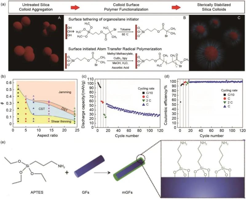 圖9 (a) A為裸露的二氧化硅納米顆粒在溶液中的聚集示意圖,B為有機硅在二氧化硅膠體表面的附著(上)和通過電子轉(zhuǎn)移原子轉(zhuǎn)移自由基聚合再生的表面引發(fā)催化劑在膠體表面接枝聚甲基丙烯酸甲酯(PMMA)的方案(下),C為通過表面接枝PMMA而穩(wěn)定的二氧化硅納米顆粒示意圖;(b) 含有不同長徑比和體積分數(shù)硅納米棒電池電解液的流變圖;組裝的全電池,NMC|EC/EMC/LiTFSI/33%·AR(5)·SiO2納米棒|石墨,在C/10、1 C、2 C和1 C下循環(huán)時放電容量圖(c)和庫侖效率變化圖(d);(e) mGFs制備過程